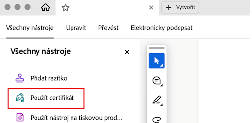 1. Otevřete si Adobe Reader, otevřete si libovolný soubor PDF a následně zvolte Zobrazit všechny nástroje > Použít certifikát